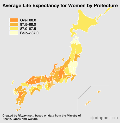 Mientras que en la prefectura de Aomori tiene la esperanza de vida promedio más corta para hombres y mujeres, con 79.27 años y 86.33 años, respectivamente. En comparación con la encuesta anterior de 2015, la esperanza de vida de hombres y mujeres aumentó en todas las prefecturas.