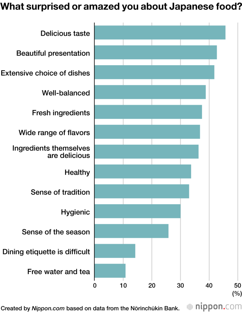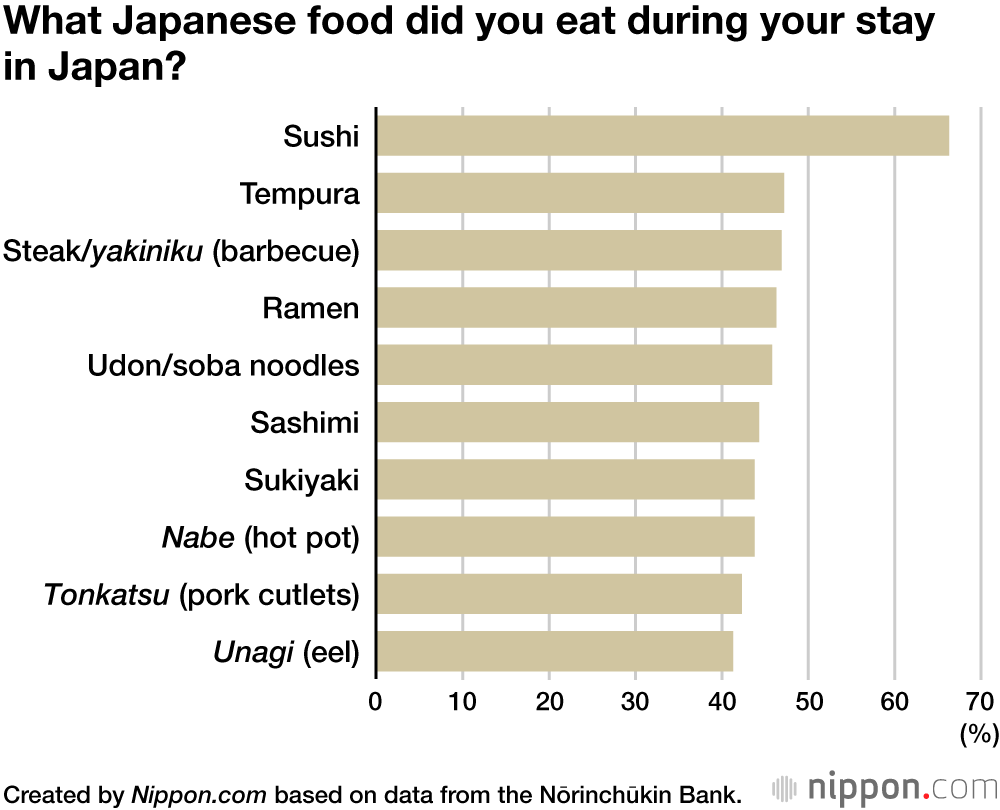 A los 1,200 encuestados que procedían de Estados Unidos, Gran Bretaña, Francia, China y Corea del Sur se les preguntó qué tipo de comida japonesa habían comido durante su estancia en el país. Entre sus respuestas hubo una gran variedad de respuestas, incluyendo el tempura, ramen, sushi, yakiniku, soba, sashimi y más.
