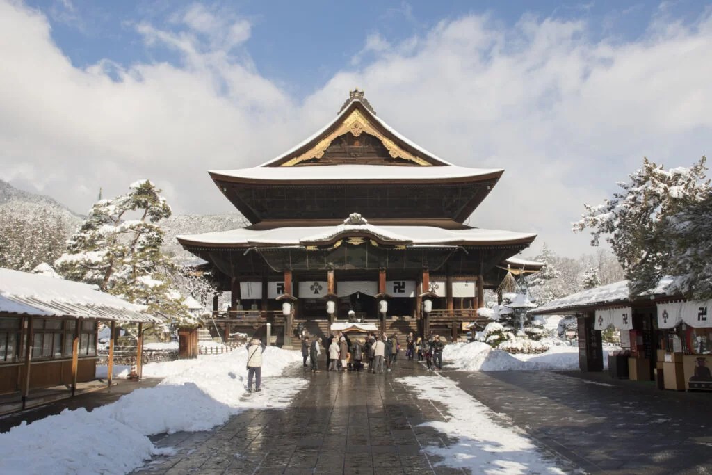 La vida en Nagano está profundamente conectada con la espiritualidad y las estaciones. Uno de los rituales más conocidos es el Kaidan Meguri, una experiencia en completa oscuridad bajo el altar del Zenko-ji, donde los visitantes buscan simbólicamente la iluminación.