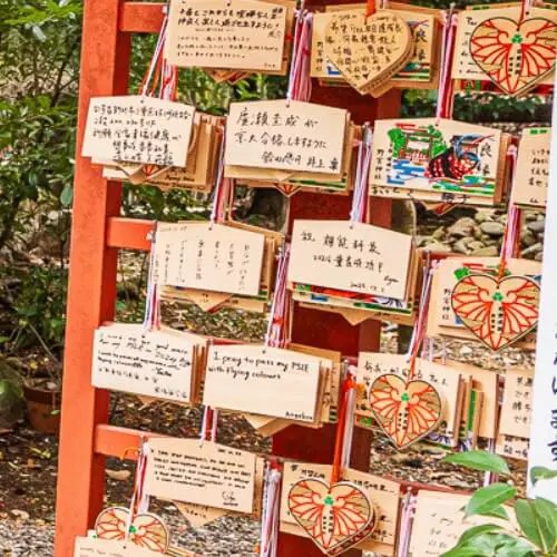 - Ema: pequeñas tablillas de madera donde los visitantes escriben sus deseos y las cuelgan en el santuario.