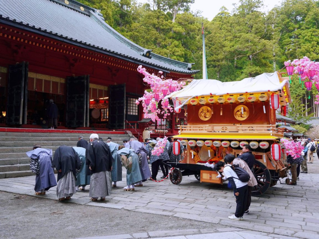 Uno de los elementos más distintivos del festival son sus carrozas decoradas, conocidas como yatai. Cada barrio de Nikkō construye y exhibe la suya, adornada con flores artificiales que representan la primavera en su máximo esplendor.